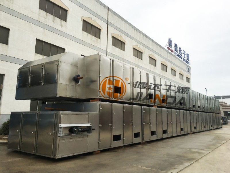 3、标准化生产,可根据产量增加段数。 将需要处理的物料通过适当的布料机构,如星型布料机、摆动 带、粉碎机或造粒机,分布在输送带上,输送带通过一个或几个加热单元组成的通道,每个加热单元均配有空气加热和循环系统,每一个通道有一个或几个排湿系统,在输送带通过时,热空气从上往下或从下往上通过输送带上的物料,从而使物料能均匀干燥。 干燥的类别:脱水蔬菜、颗粒饲料、味精、鸡精、瓜子、椰蓉、有机颜料、合成橡胶、丙烯纤维、药品、药材、小木制品、塑料制品、电子元器件老化,、固化等。